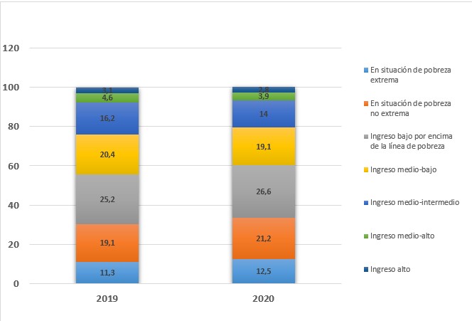 A partir del surgimiento de la enfermedad, y de las medidas adoptadas por diferentes gobiernos del mundo para frenar su propagación, se trastocaron de forma tangible las dinámicas de las distintas sociedades y regiones. Revelando así, no solo nuevas problemáticas socioeconómicas sino también problemáticas sociales preexistentes (desigualdad, exclusión, estigma). Por consiguiente, la pandemia, las medidas de contención y prevención social de emergencia para frenar la pobreza y la pobreza extrema no fueron suficientes, la mayoría de los países tuvieron un deterioro distributivo en el ingreso per cápita. En el año 2020, se presentó un aumento de la tasa de la pobreza extrema en un 12,5% y la situación de pobreza estaría en un 33,7% (Ver Figura 1). Así mismo, se observa una reducción de los ingresos laborales, movilidad descendente en los estratos de ingresos medio a medio bajo. Que, sin duda justifican el indagar acerca de los desafíos que enfrenta el mundo ante la emergencia sanitaria, además de explorar algunas tendencias que orienten la comprensión de sus dinámicas futuras desde el campo de las ciencias sociales.
