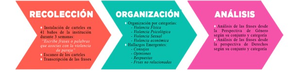 Concretamente se analizaron 1.168 frases recolectadas en una institución universitaria de carácter privado en Colombia. Las frases fueron recolectadas como parte de una campaña de sensibilización sobre violencias contra las mujeres; para ello se instalaron carteles en los baños de la institución con la siguiente inscripción: “Utiliza este espacio para escribir frases o palabras que relaciones con la violencia de pareja”. Los carteles fueron dispuestos en 41 baños de la institución (para mujeres, para hombres y mixtos) al servicio de estudiantes, docentes, trabajadoras y trabajadores de la institución. Dado su anonimato, no se pueden clasificar con certeza los participantes, sin embargo, la comunidad universitaria está integrada principalmente por población estudiantil (57% mujeres, 43% de hombres; entre 17 y 24 años); el 51% de la población universitaria cuenta con poder adquisitivo bajo, el 34% medio y el 15% alto; al momento de su participación la mayoría de la población estudiantil vivían con sus familias y trabajaban para su sostenimiento (93%).