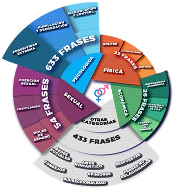 Por su parte, aunque las frases sobre violencia física son directas: “maltrato físico” “violencia física”, “golpes”, “puños”, “que me muerdan”, resaltan aquellas en que se encuentran referencias a la justificación de la violencia: “Lo hago porque te amo”, “Una justificación por cada golpe”, “si no te pega, no te ama” en las que incluso se asocia el amor a la violencia: “Tú me hiciste enojar y por eso te golpeé, perdón yo te amo mucho”. Cabe resaltar que para todas las frases de violencia física es coherente presumir el cruce con la violencia psicológica que lógicamente le subyace.