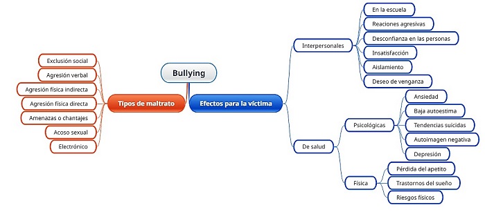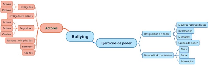 En la anterior imagen es posible entender el fenómeno del bullying como un ejercicio repetitivo de poder con unas particularidades, donde hay un peso más importante sobre ciertos tópicos como la fuerza física y psicológica que, llevan a ejercer esta práctica sobre niños más vulnerables. Sin embargo, se suman a esta compleja trama, varios actores que permiten que dichas acciones ocurran, así como diferentes tipos de maltrato y unas consecuencias para la víctima como se enuncian a continuación: