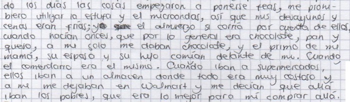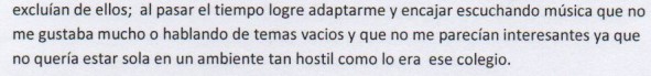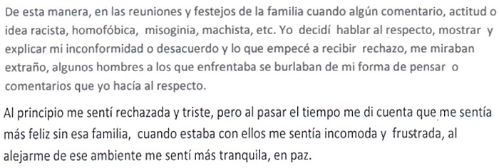 En el relato se constata lo que se va a considerar una “autoexclusión necesaria”, que proviene de una exclusión inicial externa de parte de la familia, por las ideas que sostiene la estudiante y que van en contra de formas de discriminación pero que genera un rechazo de la familia. Ante lo cual, la estudiante opta por alejarse de esa familia que no la respeta, no la valora y la juzga y rechaza por su manera de pensar y que, como la menciona la autora de la narrativa no es un proceso sencillo, pero a la larga genera sentimientos de paz y tranquilidad.