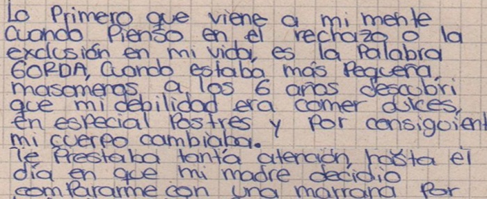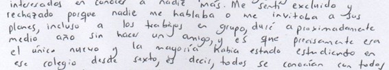 En las actividades relacionadas con la exclusión se procuró, en primer lugar, que los estudiantes se reconocieran como sujetos excluyentes y ubicaran en ellos mismos, las causas de dicho comportamiento. Como la actividad fue realizada de manera oral y al no contar con mucha participación de ellos, pues algunos negaron haber excluido a alguien, no se recuperan en el presente artículo. Consiguientemente en el relato de cuando los y las estudiantes se habían sentido excluidos/as, se buscaba que ellos y ellas recordaran y analizaran esos momentos en los que se habían sentido vulnerables y excluidos y las emociones e impactos que esto generó en sus vidas.