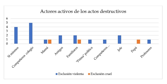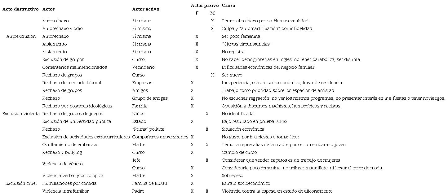 En la Tabla 2, se pueden observar los hechos que narraron los estudiantes, sus causas, actores pasivos y activos, y la clasificación otorgada según el tipo de acto destructivo, se destaca que una buena parte de los relatos hacen referencia a causas de exclusión de tipo estructural como el machismo, el difícil acceso a la educación superior pública y al mercado laboral, temas económicos, estereotipos sociales, entre otros. Evidenciando con ello que, a pesar de la corta edad de los y las participantes, han padecido de diferentes tipos de exclusión y generan igualmente autoexclusión al interiorizar esos juzgamientos y rechazos externos, una práctica que se retrató en el trabajo de Kerman (2010).