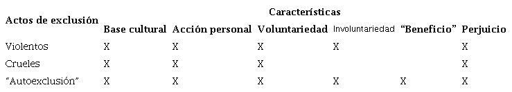 Así las cosas, un acto de exclusión violento es una actitud de rechazo hacia una o varias personas sea voluntaria o no, y un acto de exclusión cruel se determina por la clara intención de producir sufrimiento en alguien más, una actuación considerada voluntaria.