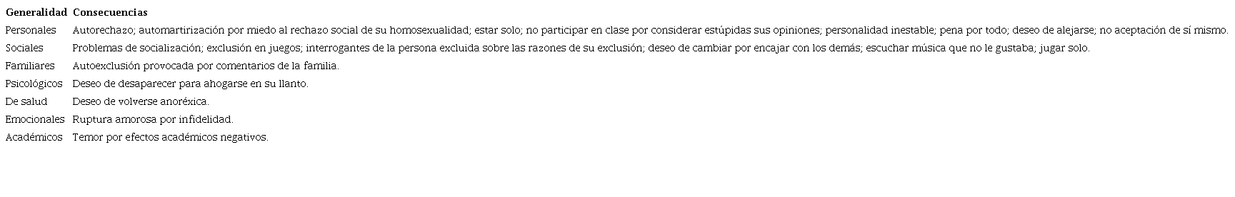 En la Tabla 3 se encuentra el desenlace de los actos destructivos, con unas repercusiones que de una u otra forma, afectan a la persona que sufre y que la pueden llevar a aislarse por voluntad propia o de manera obligada. Surgen interrogantes sobre las razones de por qué fueron victimizados, o desarrollan pensamientos autodestructivos como la idea de la anorexia o el “deseo de desaparecer”, pensamientos que pueden convertirse en algo aún más peligroso. Se resalta que varios de estos efectos, coinciden con los efectos del bullying expuestos por Kerman (2010).