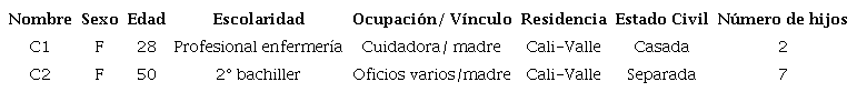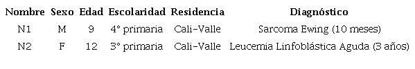 En el estudio participaron un niño y una niña entre 8 y 12 años de edad con diagnóstico oncológico pediátrico susceptibles de recibir acompañamiento por cuidados paliativos (ver Tabla 1) y sus cuidadoras (ver Tabla 2). Cabe resaltar que, el niño y la niña participantes no necesariamente se encontraban en proceso de fin de vida, sin embargo, dada la cronicidad de su enfermedad, recibían un acompañamiento integral y personalizado por parte del equipo de salud. Si bien el niño y la niña participantes en el estudio son sujetos con capacidad de decisión durante su proceso de salud-enfermedad, por su condición jurídica de menores de edad se acordó con sus cuidadores principales (representantes legales) la firma del consentimiento informado para el manejo de la información y publicación de los resultados.