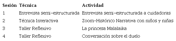 Se realizaron cuatro encuentros en los que se interactuó con los pacientes y sus cuidadoras a través de las técnicas propuestas como se presenta en la Tabla 3. Esta serie de encuentros se realizó de manera independiente con cada niño y niña, y su cuidadora.