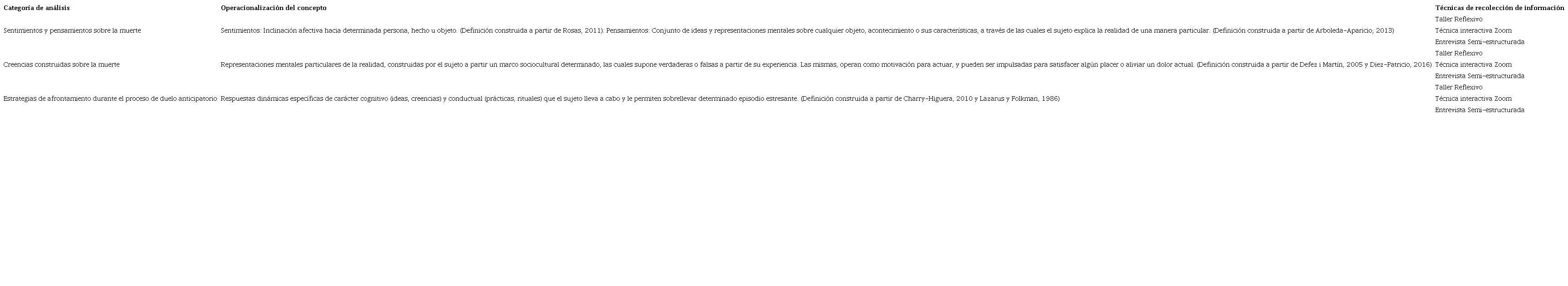 Cada encuentro con la población estuvo centrado en un objetivo específico de la investigación, con técnicas diferenciadas, los cuales fueron registrados a través de audios y fotografías. En la Tabla 4 se presenta la articulación entre las categorías de análisis, la operacionalización de los conceptos que guiaron la indagación y las técnicas de recolección de la información.