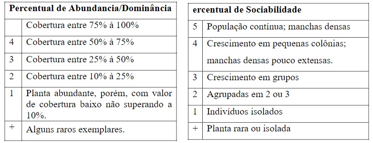Quanto às espécies vegetais, os parâmetros de análises mensurados já são utilizados na ciência Botânica, veemente na Fitossociologia: abundância, dominância e sociabilidade. Os dois primeiros referem-se à equivalência do grau de superfície coberta pelas plantas, escala proposta por Braun-Blanquet (1979), e o ultimo indica o grau de agrupamento das plantas sustentado na proposta de BLANQUET (1979) e BERTRAND (1966).