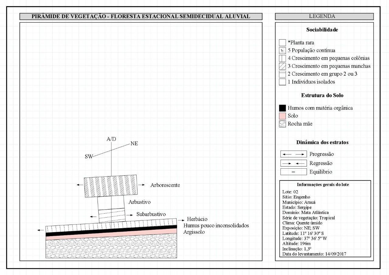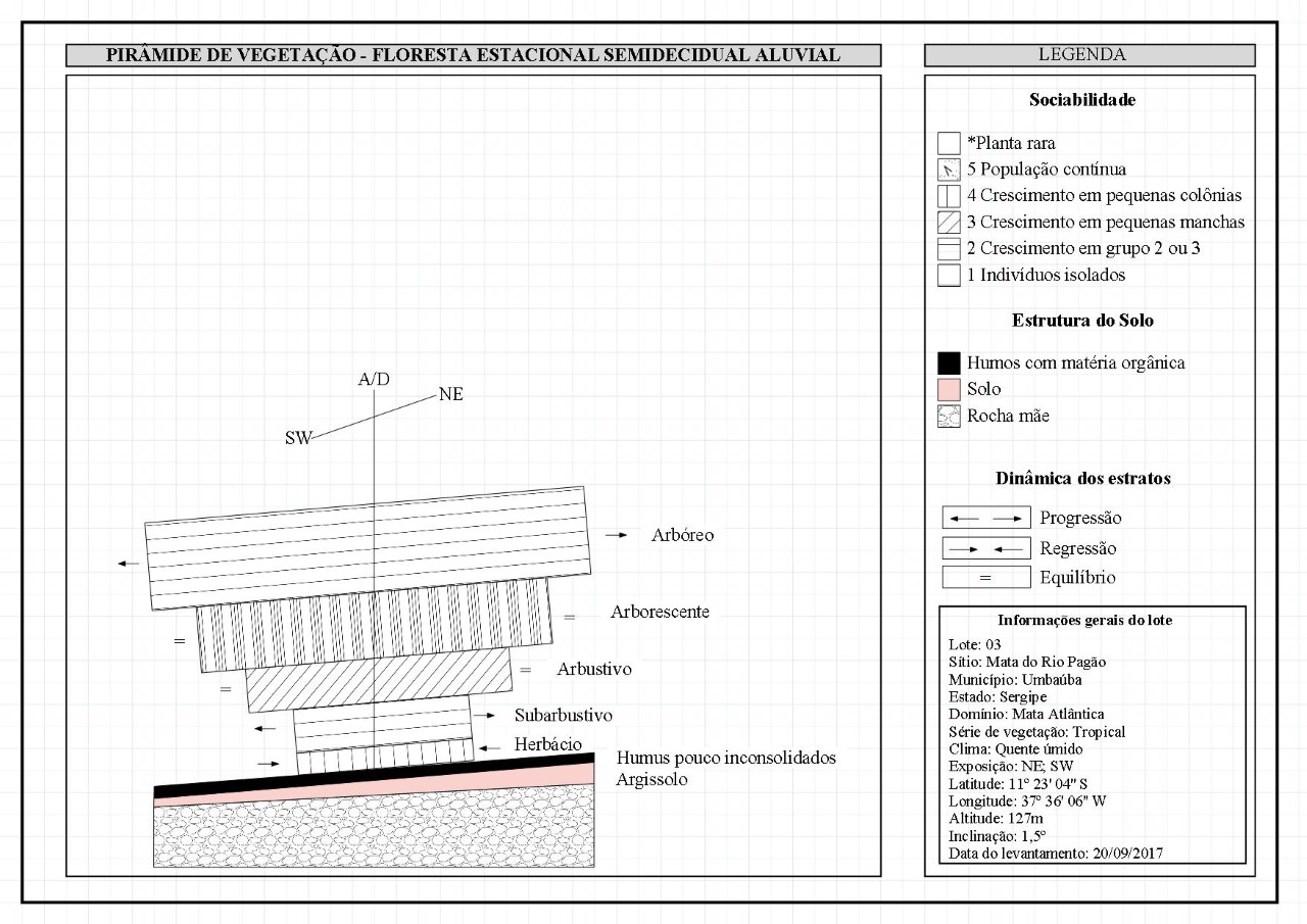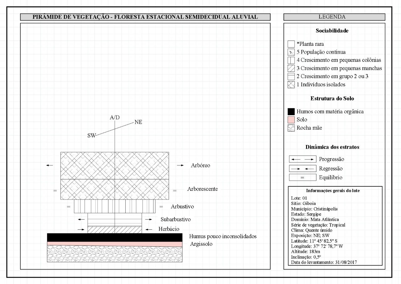 Inicialmente a técnica utilizada foi a manual proposta por Bertrand, (1966) onde sobre um papel milimetrado se constrói um segmento de reta horizontal de 10 cm. de comprimento. Ergue sobre sua base e no centro, perpendicularmente, o eixo da pirâmide, em seguida coloca os estratos de vegetação simetricamente em relação ao eixo, considerando sua ordem normal de superposição, de seu índice de recobrimento (abundância-dominância 1 = 1 cm, 2 = 2 cm, 5 = 5 cm). A espessura de cada estrato, representado na pirâmide, está determinada arbitrariamente, de modo a facilitar as interpretações biogeográficas: estrato 1 = 0,5 cm, estrato 2 e 3 = 1 cm, estrato 4 = 1,5 cm, estrato 5 = 2 cm. Posteriormente, foi feito um trabalho gráfico no software Layout 2017 (Trimble) para facilitar a visualização das informações. Além dessas informações colocam-se outras anotações na base da pirâmide como: a espessura, a superfície coberta, o tipo de solo, a rocha mãe, a inclinação, a insolação, e por fim as flechas para indicar a dinâmica dos estratos.
