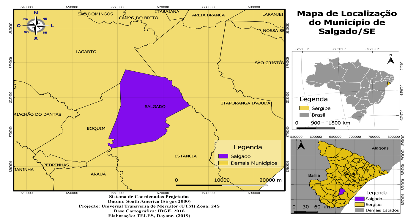 O município de Salgado está localizado na porção centro sul do estado de Sergipe e corresponde a uma área de 247,579 quilômetros quadrados (mapa 01), sendo uma região predominantemente ocupada por pastagens e atividades agrícolas (SIQUEIRA/EMBRAPA, 2010, p. 82). Sua população absoluta é de 19.970 habitantes, onde cerca de 7,7%, desse percentual total, são de pessoas que possuem algum tipo de ocupação formal (IBGE, 2018, p. 01). Isso demonstra o nível de dependência que a população do município tem sob as atividades no meio rural (geralmente não formalizadas). Sendo assim, essas características podem revelar um município marcado pelos aspectos rurais, no entanto, Abramovay (2000, p. 10) reitera ainda que “além de uma abordagem que enfatiza a relação com a natureza, às áreas não densamente povoadas e a dependência do sistema urbano, é importante abordar as ruralidades a partir da identificação de atividades mais sustentáveis para geração de renda”.