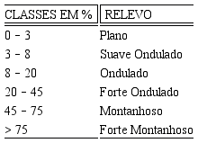 Para o mapa de declividade foi utilizado o MDE já processado no ArcGis e no mosaico da área de estudo, pois assim, englobaria somente a área de estudo. A classificação foi adotada de acordo com a metodologia da Empresa Brasileira de Pesquisa Agropecuária (EMBRAPA), definido como valores de classes observados na