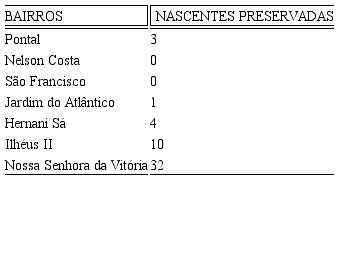 Através de imagem de satélite disponível no software ArcGis 10.3.1. na extensão Basemap foi possível obter uma análise supervisionada das condições ambientais das nascentes e quais delas se encontram em consolidações urbanas na referida área de estudo. De acordo com Tabela 2 os bairros que apresentaram mais nascentes preservadas, por sua vez, são os bairros Nossa Senhora da Vitória e o bairro Ilhéus II.