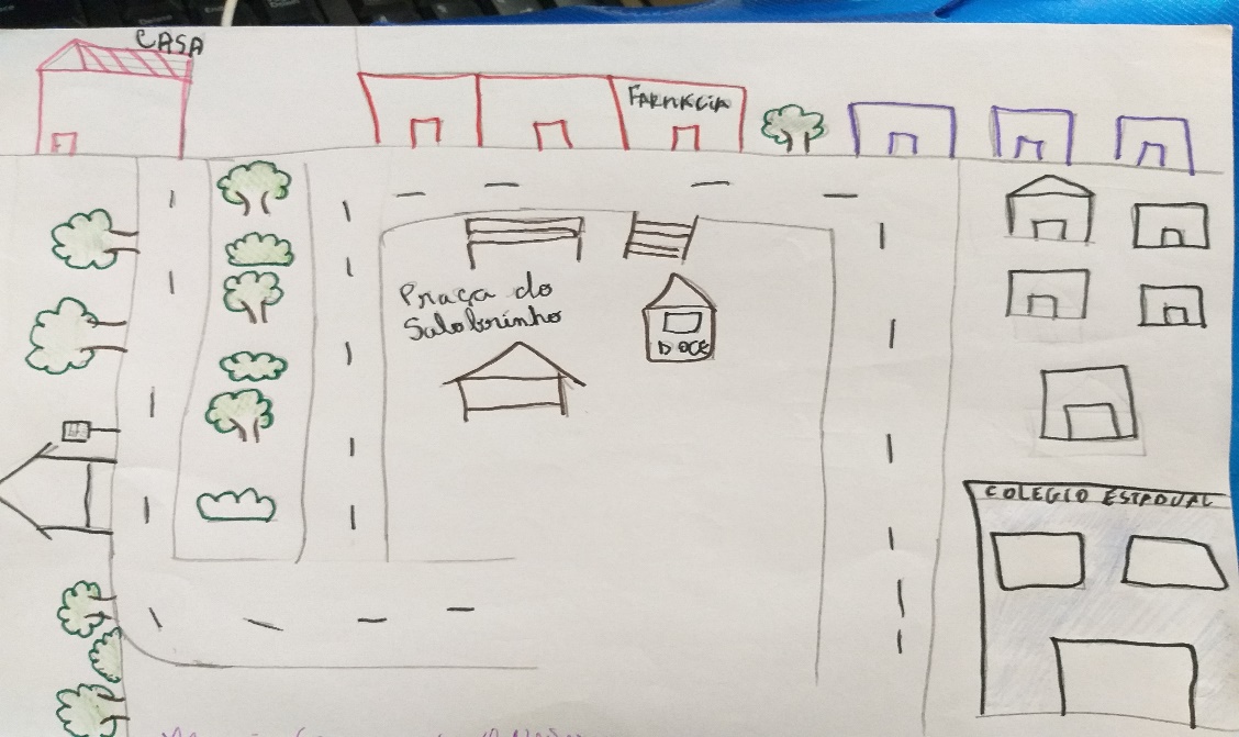 Nas proposta das atividades práticas com mapa, a princípio foi realizada uma sondagem do que foi absorvido pelo aluno durante as aulas de introdução ao conteúdo, para assim realizar a interpretação dos mapas, através de confecções de mapa mental do percurso de casa para escola (Figura 1), utilizado como atividade de sondagem, para compreensão de conteúdos geográficos como localização, orientação, escala entre outros. As atividades foram voltadas para a participação do aluno na confecção do material, com objetivo de melhor compreensão do conteúdo.