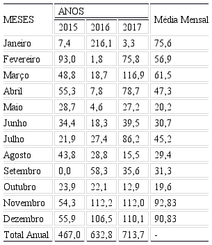 Foram coletadas informações sobre as ocorrências causadas pelas precipitações intensas na Cidade de Vitória da Conquista bem como os dados diários e mensais das precipitações entre 2015 e 2017. De acordo com os dados de precipitação mensal e anual do período estudado (Tabela 1), podem se perceber a forma de distribuição das precipitações. Um dado que nos chama a atenção é o mês de janeiro de 2016, o qual choveu 34,14% da precipitação anual. Dentre os anos estudados, todos apresentaram precipitação abaixo da normal climatológica que é de 733,9. O ano de 2015 apresentou um desvio negativo de 266,9 milímetros.