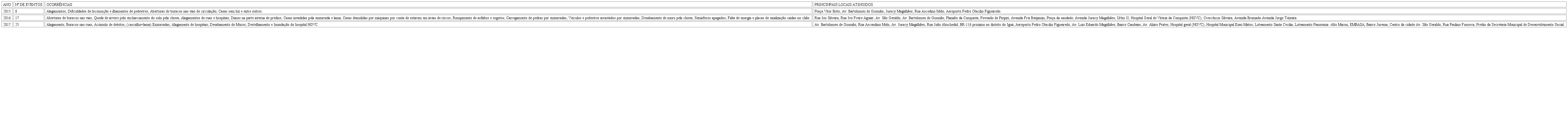 Dentre os episódios levantados na pesquisa e registrados na imprensa, pode se destacar os alagamentos, enxurradas, queda de muro e danificação de carros. É possível observar, no Painel 1, algumas das ocorrências causadas pelas chuvas em Vitória da Conquista.
