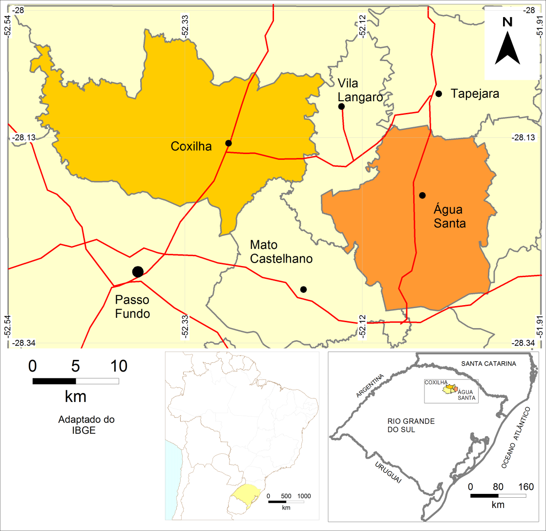 Água Santa está localizada ao Nordeste do estado do Rio Grande do Sul (Figura 1), os aspectos físicos desse município são típicos dessa região, ou seja, com o predomínio do Bioma Mata Atlântica, em especial a Mata de Araucária, e o relevo é composto por rochas basálticas do Planalto Meridional. Estima-se uma população de “3.722 habitantes, sendo que, 2.275 residem na zona rural e 1.447 residem na zona urbana do município” (LISBOA; JORGE, 2018, p. 2).