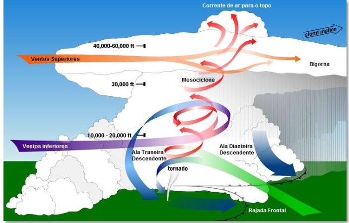 Os tornados podem se formar na nuvem Cumulonimbus,caracterizada como uma nuvem de tempestades severas entre um ambiente instável e de convecção profunda, com baixa pressão atmosférica (SOMAR, 2018).