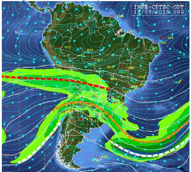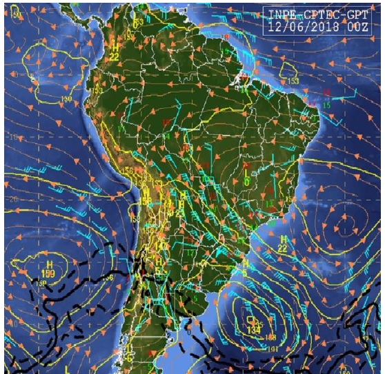 Na análise da carta sinótica de 250 hPa do dia 12/06/2018, nota-se o predomínio da circulação anticiclônica, o Jato Subtropical (JST) e o Jato Polar (JPN) formam um cavado entre o sul da Bolívia e Argentina, no qual, favoreceu a nebulosidade na partesul doBrasil, conforme observado na figura 4 (METEOROLOGIA, 2018).