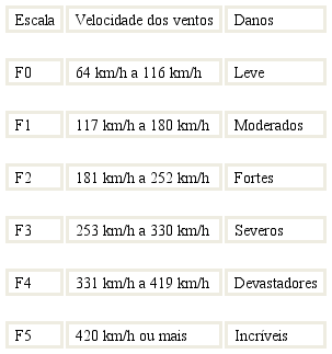 O Quadro Imostra a definição da escala Fujita que vai de F0 a F5, com relação avelocidade dos ventos dos tornados medidos em quilômetros por hora (Km/h), e os seus respectivos danos.