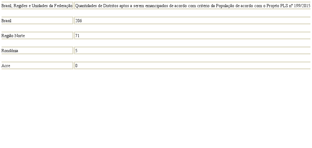 De acordo com os mesmos dados do IBGE (2015), do Projeto de Lei Complementar último vetado pela presidenta Dilma Roussef até o atual Projeto 199/2015, ocorreu uma redução significativa na quantidade de distritos aptos a serem emancipados de acordo com o critério da população. Nas regiões Nordeste, Sudeste e Sul, em que os valores mínimos aumentaram. Na região Nordeste estava apto a emancipar 91 distritos (critério da população em torno de 8.500 habitantes), no atual Projeto reduziu para 41 (critério da população em torno de 12 mil habitantes). Na região Sudeste reduziu de 101 (critério de 12 mil habitantes), para 73 (critério de 20 mil habitantes). Na região Sul, com os mesmos critérios da região Sudeste, a redução foi de 23 para 13.