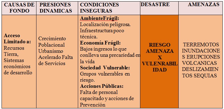 El modelo par, modelo de presión y liberación de los desastres, explica la forma como los factores subyacentes y causas de fondo incorporadas en la vida diaria dan origen a presiones dinámicas que afectan grupos particulares y conducen a condiciones específicamente inseguras; tomando en cuenta que dos dinámicas generan el riesgo de desastre y en su caso extremo el desastre, la amenaza y la vulnerabilidad creciente.
