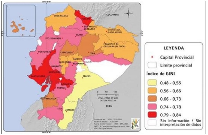 La inequidad en la tenencia de tierra en el Ecuador es una de las más altas a nivel de América Latina tomando en cuenta que somos un país relativamente pequeño en comparación con otros de la región, el coeficiente de Gini utilizado en este caso para medir la desigualdad en el acceso al recurso tierra señala um 0.81 lo que es un resultado alarmante, el 99.9% de las UPA tienen extensiones inferiores a 640 ha, es decir tan solo el 0.01% tiene extensiones superiores a la mencionada anteriormente.