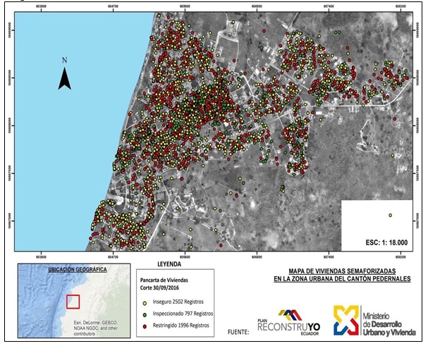 Como se observa en el mapa número 2, la afectación con daños considerables, catalogados como inseguros o restringidos suman un numero de 4998 registros que representan al 50% del total de predios de la zona urbana, de estos tan solo el 47% tenían posesión legal y registrada en el Departamento de Avalúos y Catastros del Municipio de Pedernales, por lo que se determina que más 3000 predios afectados sin registro, como se mencionó en párrafos anteriores, el problema salió a la luz luego del sismo , instituciones nacionales e internacionales se encontraron con un serio problema al momento de entregar la asistencia a los damnificados