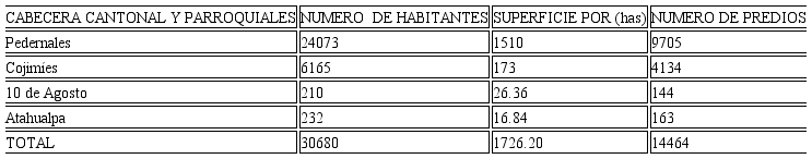 Según el Plan de Desarrollo y Ordenamiento Territorial la zona urbana cuenta con una extensión de 123,63 has, y una proyección de expansión de la misma dando una totalidad de 317,53 has, hay que recalcar que las cabeceras parroquiales fueron declaradas zonas urbanas, pero no cuentan con la información cartográfica necesaria.