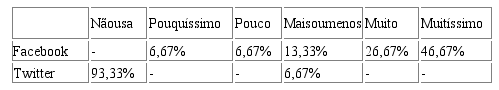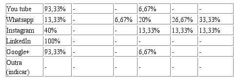 O Quadro 1 mostra ainda que 86,67% delas utilizam o Whatsapp, enquanto que 60% usam o Instagram. O Twitter, You Tube, Linkedin e Google+ são redes sociais com pouca freqüência de uso no segmento de confecções investigado.