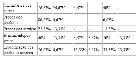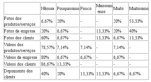 Em conformidade com o Quadro 2, 73,33% das empresas pesquisadas inserem nas redes sociais fotos dos produtos/serviços na frequência de muito a muitíssimo. Nesta mesma frequência, 60% delas postam da própria empresa. Verifica-se também que para percentuais abaixo de 20% na frequência de muito a muitíssimo uso, ações das empresas nas redes sociais são voltadas realizadas por meio de divulgação de fotos dos clientes, vídeos dos produtos/serviços, vídeos da empresa, vídeos dos clientes, depoimentos dos clientes, preços dos produtos e preços dos serviços. Por fim, constatou-se que as empresas divulgam nas redes sociais comentários dos clientes, atendimento pós-venda e especificação de produtos/serviços, respectivamente, com frequência relativa de 40%, 33,33% e 46,66%.