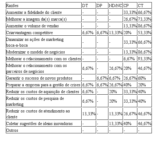 As principais estratégias utilizadas pelas empresas pesquisadas estão voltadas para: aumentar a fidelidade do cliente; melhorar a imagem da(s) marca(s); aumentar o volume de vendas; dinamizar as ações de marketing boca a boca; modernizar o modelo de negócio; e melhorar o relacionamento com os clientes, posto que todas as empresas pesquisadas concordaram parcialmente ou totalmente com as razões estratégicas exibidas no Quadro 3.
