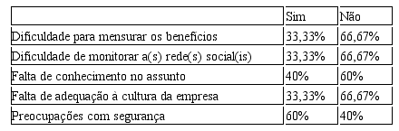 Identificou-se que a preocupação com a segurança é a principal barreira apontada pelas empresas para utilização das redes sociais, representando 60% do público entrevistado. Uma segunda barreira apontada foi a falta de conhecimento no assunto (40%), seguida de dificuldades para mensurar os benefícios, realizar o monitoramento das informações e promover adequação das redes sociais à cultura da empresa. Silva (2012) acredita que a falta de conhecimento técnico pode ser uma barreira para adoção dessa ferramenta nas empresas brasileiras, pois quando não se tem controle de uma rede social, tornar mais difícil perceber os benefícios dela.
