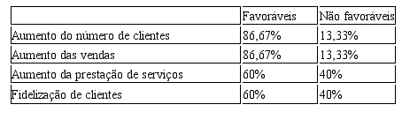 Esse ponto de vista pode estar relacionado com o processo de adaptação das empresas pesquisadas com os novos recursos tecnológicos no âmbito das redes sociais. Constatou-se que as empresas precisam de suporte externo para iniciar a implantação das redes sociais como ferramentas estratégicas para os negócios. Vale ressaltar que as empresas conseguiram destacar os benefícios alcançados, principalmente no que tange ao incremento das vendas e fidelização de clientes.