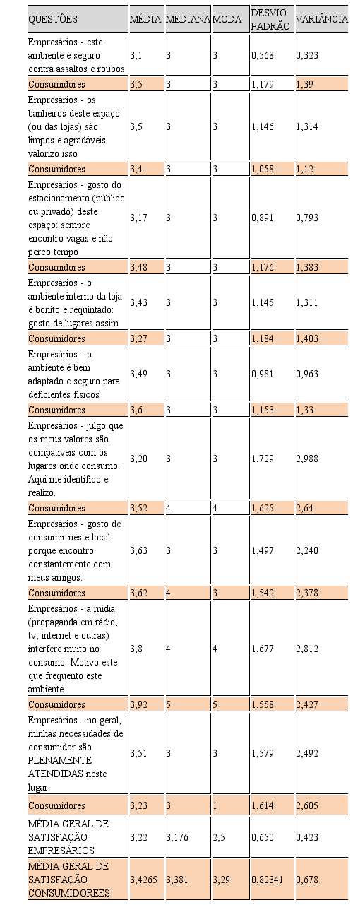 Quanto à média geral de satisfação entre os empresários de todos os atributos desta escala e fazendo um estudo de todas as questões referentes à maneira como os empresários enxergam a satisfação do consumidor, com scores de 0,650 para desvio padrão e 0,423 para variância, portanto altamente significativos, conclui que o shopping apresenta os maiores scores de satisfação (sob a perspectiva dos empresários) com escores de: 2,5 (moda) 3,22 para a média; 3,17 para a mediana. Assim, o Shopping aparece como espaço de maior satisfação entre os três pesquisados.