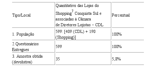 A unidade de análise deste estudo – população alvo6 – constitui-se de: 1) Empresários que possuem lojas no Shopping, comércio do Centro da cidade, do bairro Brasil e demais bairros e 2) consumidores residentes em Vitória da Conquista, capital do estado e, por fim, consumidores potenciais e/ou flutuantes da microrregião do Sudoeste da Bahia. O período da pesquisa entre consumidores e empresários aconteceu entre os dias 01 de junho a 30 de julho de 2016, ou seja, foram disponibilizados dois meses para a devolução dos instrumentos respondidos, quer seja os questionários impressos ou mesmo via e-mail e redes sociais.
