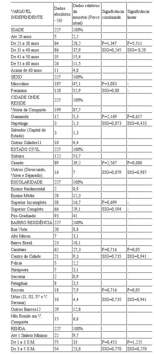 Em se tratando que a tabela é autoexplicativa e que há limites de páginas para o referido artigo, o pesquisador entendeu que se torna desnecessário e redundante tecer interpretações ou mesmo apresentar os gráficos quanto às tabelas 3 e 4 que descrevem o perfil dos consumidores e empresários. Entretanto, os maiores achados deste grupo de dezoito questões inerentes à satisfação do consumidor com os três espaços geográficos, comparando a média de satisfação com as variáveis independentes pessoais e espaciais, ou seja, as que apresentaram maiores coeficientes de significância foram: estado civil com F=2,567 e significância de 0,079 na significância combinada e de F=0,000 na significância linear. A outra variável foi bairro de residência com F=0,05 e significância=0,941. Isso quer dizer que estas foram as variáveis de maior valor preditivo encontrado nesta escala, sugerindo uma congruência entre satisfação do consumidor entre os espaços pesquisados com os bairros de residência e também estado civil, se caracterizando neste trabalho como os melhores preditores de satisfação.