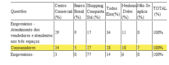 A pesquisa comprovou também que, entre os dois grupos de respondentes pesquisados (consumidores e empresários), o bairro Brasil é o espaço de menor satisfação entre eles, não apresentando em nenhum dos atributos da escala, um escore superior aos outros dois, sendo muito pequeno o quantitativo de consumidores que o avaliam positivamente, conforme se pode comprovar pelas medidas pertinentes. Entretanto, com base nas informações secundárias do IBGE, SEI e outros órgãos, o bairro Brasil se configura como o segundo maior comércio de V. da Conquista, sendo este o motivo de o pesquisador ter comparado o mesmo na pesquisa.