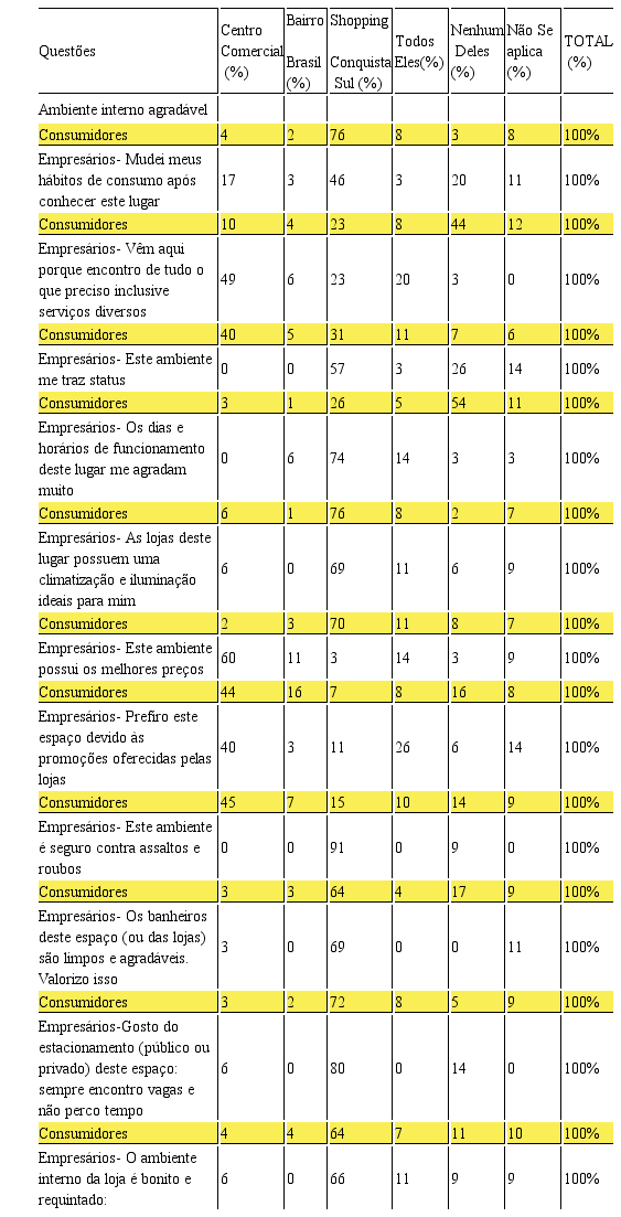 Assim, o que interessa de fato ao pesquisador e para o presente estudo é como o consumidor avalia os três espaços. Quanto ao empresário é uma percepção dele enquanto consumidor e de como ele imagina que seja a satisfação dos consumidores. Os resultados assim como a análise serão apresentados na tabela 4, em percentual: