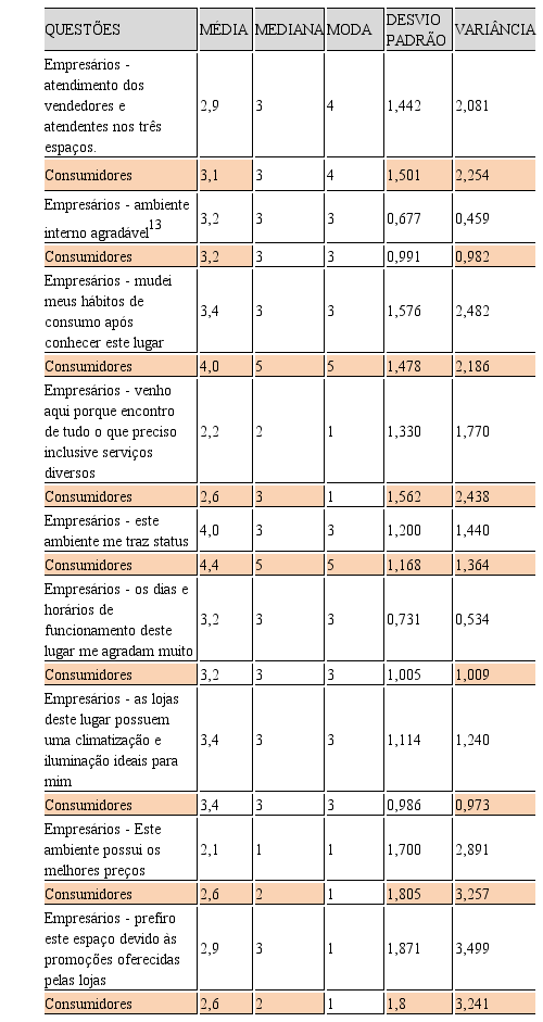 Quanto aos empresários, no geral, foram perspicazes em perceber empiricamente as tendências, sentimentos e satisfações/insatisfações dos consumidores para com os três espaços estudados, ou seja, Shopping Conquista Sul, Centro Comercial e bairro Brasil uma vez que além de conhecerem e perceberem o comportamento dos consumidores, também consome no mercado. Na maioria quase que absoluta dos casos, as respostas foram compatíveis entre aquelas dadas pelos consumidores e aquelas apontadas pelos empresários que, “se colocaram na posição de consumidor” para avaliar os questionamentos. Assim, extraindo-se a tirando-se a média geral de todos os atributos desta escala e fazendo um estudo de todas as questões referentes à maneira como os empresários enxergam a satisfação do consumidor, com escores de 0,650 para desvio padrão e 0,423 para variância, portanto altamente significativos, conclui que o shopping também apresenta os maiores scores de satisfação (sob a perspectiva dos empresários) com escores de: 2,5 (moda) 3,22 para a média; 3,17para a mediana. Assim, o shopping também aparece como espaço de maior satisfação entre os três pesquisados.