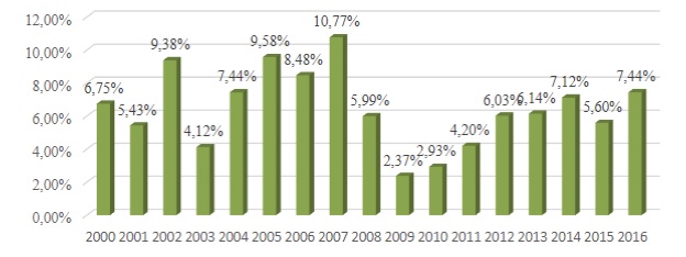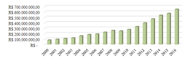 Considerando as despesas por categoria econômica, elas podem ser despesas de capital ou despesas correntes. Entre as despesas de capital destacam-se os investimentos feitos pela entidade. No período analisado houve um acréscimo na ordem de 875,37% nesse indicador de gestão. O gráfico 2 apresenta a evolução dos investimentos feitos pela Prefeitura Municipal de Vitória da Conquista nos 17 anos analisados.