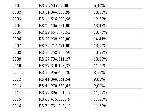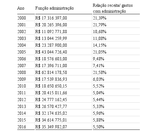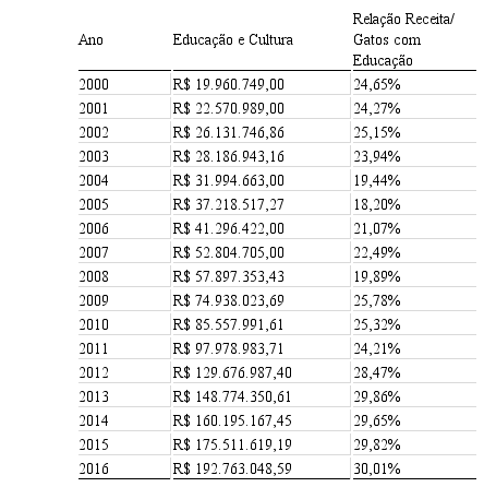 Os gastos públicos com a função educação e cultura cresceram 965,71%, no período analisado. Comparando o crescimento da função educação e cultura com os gastos administrativos pode-se concluir que houve um esforço da gestão municipal em aumentar os investimentos em educação. Quando observada a relação dos gastos com educação e cultura com o total das receitas arrecadadas pelo município, destaca-se um aumento percentual desses investimentos, principalmente nos últimos 5 anos de governo, quando o índice que girava em torno dos 20%, alcançou, no ano de 2016, os 30% da receita total arrecadada, conforme demonstrado na tabela 6.