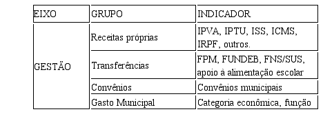Com vistas a alcançar o objetivo proposto para este trabalho foi utilizado o modelo apresentado na cartilha Desenvolvimento Local com Equidade em Municípios de Pequeno Porte – Como Utilizar a Plataforma Básica, desenvolvida no ano de 2010, pelo Centro de Estudos em Administração Pública e Governo da Escola de Administração de Empresas de São Paulo da Fundação Getúlio Vargas. Essa Plataforma Básica é composta de informações e indicadores que têm uma atualização periódica de, no geral, um ano; o que significa que nós podemos acompanhar seu desenrolar ano a ano e, em alguns casos, mês a mês. Podemos também olhar para trás para ver como era a situação em anos anteriores. Ela está dividida em três eixos: Gestão, Desenvolvimento Econômico Local e Desenvolvimento Social e Redução das Desigualdades.