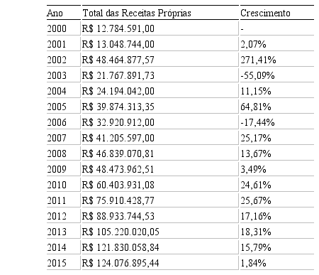 As receitas próprias arrecadadas no período estudado apresentam um crescimento geral do período de 1.057,69%. Esse crescimento é significativo quando comparado, por exemplo, com o IPCA – Índice de Preços ao Consumidor Ampliado, que é produzido pelo Instituto Brasileiro de Geografia e Estatística (IBGE) desde 1979, sendo considerado o indicador oficial do Governo Federal para aferição das metas inflacionárias, e que no mesmo período foi de 199,74%. Existe no período estudado, variação inconstante das recitas, com aumentos e diminuições que indicam uma política de arrecadação pouco planejada, pois apesar do crescimento acumulado apresentado, o mesmo não se deu de forma organizada e crescente.