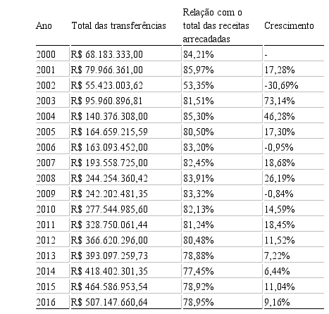 A tabela 2 apresenta os dados referentes ao recebimento de Transferências Federais e Estaduais no período analisado. Analisando a relação das transferências com o total das receitas arrecadadas pelo munícipio conclui-se que existe uma forte dependência financeira da administração local dos recursos transferidos das demais esferas de governo, posto que nos anos estudados, os valores referentes a transferências estão em torno de 80% da receita total disponível. Houve no período um aumento acumulado de Transferências recebidas de 743,80%.