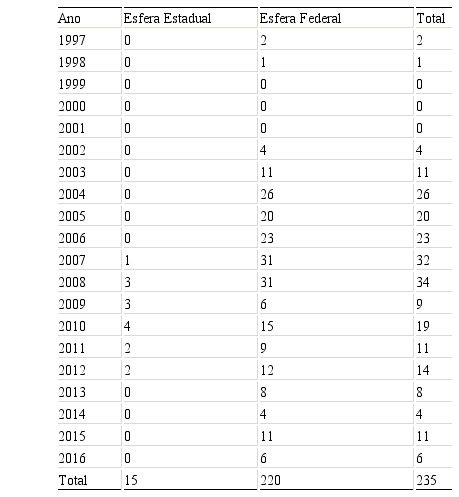 Pode-se observar que a partir do chamado “alinhamento político”, ou seja, quando o governo nas demais esferas é exercido pelo mesmo partido político, ou partidos da mesma base, o que ocorreu com Vitória da Conquista a partir do ano 2002 quando o Partido dos Trabalhadores assumiu o governo federal e mais fortemente a partir de 2007, quando o mesmo partido assumiu o governo do estado da Bahia, foi marcante para a ampliação do número de convênios firmados entre os entes públicos analisados. Quase a totalidade dos convênios celebrados foi com órgãos da União, sendo que esses representam 93,62% do volume total.