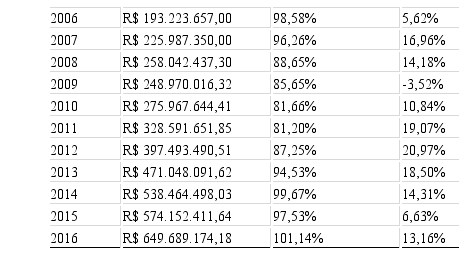 O primeiro ponto avaliado dentro do eixo da gestão é o que compreende os indicadores de arrecadação de impostos e taxas, dentre outros e que neste trabalho foi classificado como receitas próprias. Os valores apresentados na tabela 1 foram apurados a partir dos balanços orçamentários da PMVC e incluem os valores de receitas correntes e receitas de capital arrecadadas.