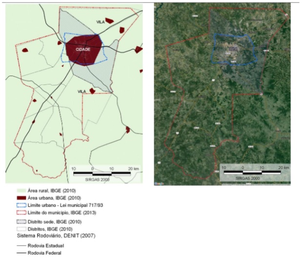 Na figura 1 foi analisada os conceitos extraídos do IBGE aplicados no município de Vitória da Conquista –Bahia, que tem área da cidade delimitada pelo conjunto de setores censitários, classificados como urbanos, pertencentes ao distrito sede e internos ao limite estabelecido pela legislação municipal. Vale destacar que, quando a cidade cresce ocupando toda a área limite do município, os dados censitários da área rural são inexistentes. A limitação física do crescimento das cidades é determinada administrativamente pelo perímetro do município que a contém. A diversidade das cidades brasileiras, sobrepostas a delimitação legal e administrativa está representada na figura 2, com os casos dos municípios situados no estado de São Paulo (região Sudeste) e Mato Grosso (região Centro-Oeste)