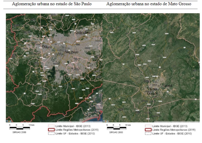Municípios como Osasco, Carapicuíba, Taboão da Serra, Diadema entre outros possuem menos disponibilidade de terras do que a própria capital do estado de São Paulo, que ao sul possui uma grande área de expansão. Salienta-se que o recorte das duas capitais São Paulo e Cuiabá, apresentados na figura 2, estão na mesma escala, possibilitando correlacionar o tamanho entre os municípios, áreas aglomeradas e a continuidade da malha urbana que ultrapassa os limites municipais.