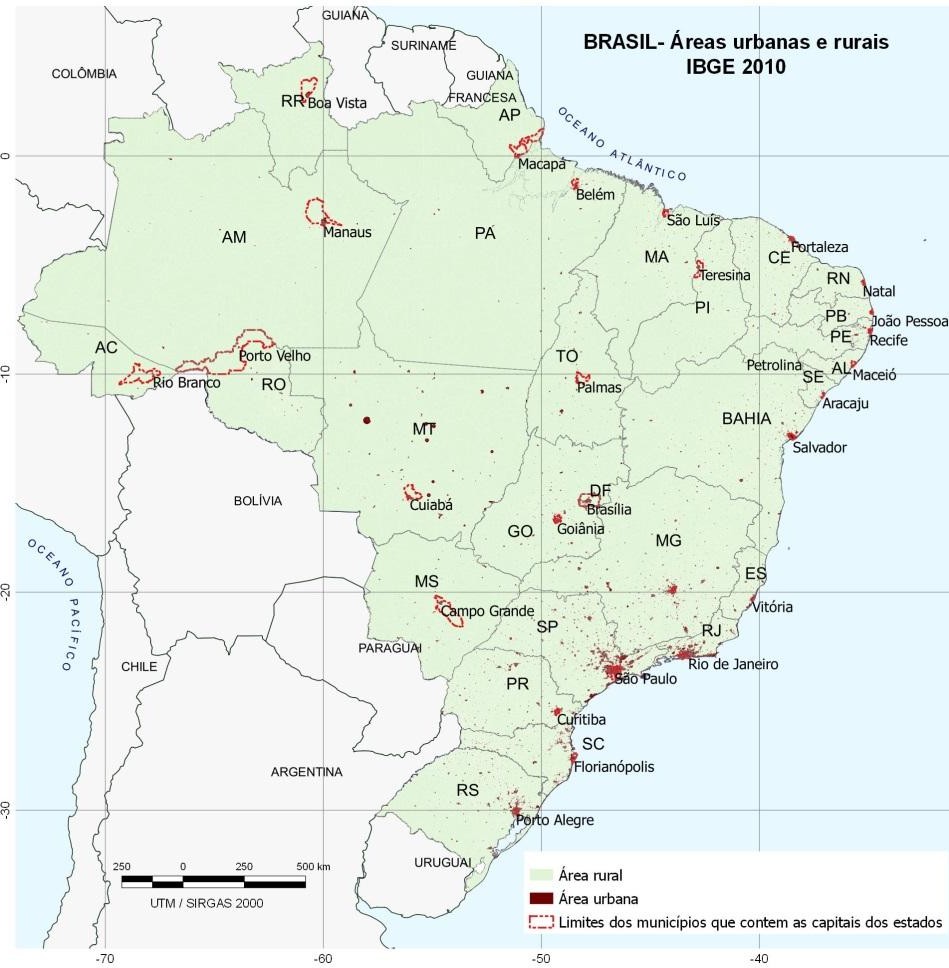 Questões que seriam particularmente analisadas em estudos locais, sem perder a noção da escala global e do entorno imediato, reforçam a necessidade de analises em diferentes escalas realizados de forma dinâmica e integrados. Ampliando essa análise territorial para todo do Brasil a figura 3 apresenta a delimitação das áreas urbanas e áreas rurais, estabelecida pela situação do setor censitário em 2010 e destaca os limites dos municípios que contém as capitais dos estados